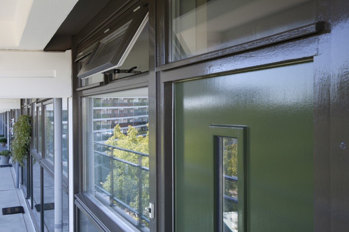 Zowel de voorgevel als de achtergevel hebben een complete upgrade gekregen. Van Wijk Vastgoedonderhoud heeft de bestaande kozijnen geschilderd en voorzien van HR++-glas. Verweij Houttechniek heeft alle draaiende delen vervangen en de borstwering geïsoleerd en voorzien van colorbel glaspanelen. “Voor de voordeur en de balkondeur is gekozen voor een (EPA-)deur van Verweij: een op maat gemaakte plaatdeur met uitstekende isolatiewaarden en verkrijgbaar in veel verschillende uitvoeringen. Verder zijn alle ramen vervangen – van klepramen tot draairamen – en waar nodig voorzien van ventilatieroosters,” licht Rob toe.
